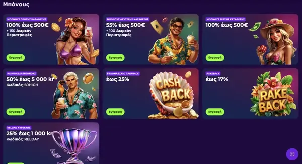 Πέρα από τα βήματα καλωσορίσματος, εναλλάσσουμε προωθητικές ενέργειες που ταιριάζουν σε διαφορετικά budgets. Η Λοταρία Περιστροφών για Νέους Παίκτες λειτουργεί ως εβδομαδιαία κλήρωση με pool €2,500 σε δωρεάν περιστροφές. Για μεγαλύτερες καταθέσεις, το Μπόνους High Roller προσφέρει match 50% έως €500 συν 50 δωρεάν περιστροφές, και το Κυριακάτικο Reload Bonus προσθέτει 25% έως €100.
